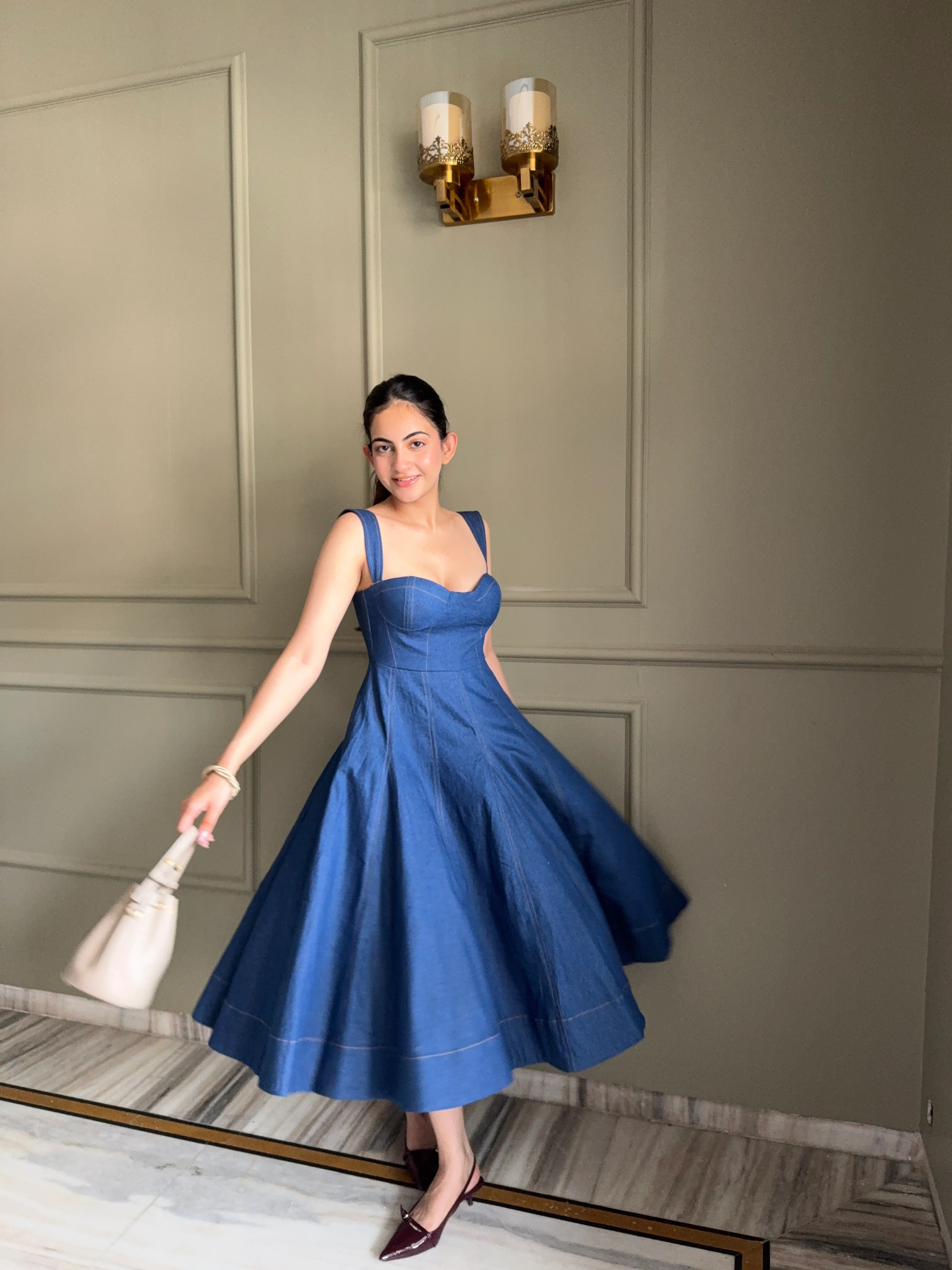 This denim dress features sleeves, making it the perfect choice for a day out. Its waist design adds a touch of elegance to your ensemble. Pair with heels for a stylish and sophisticated look.